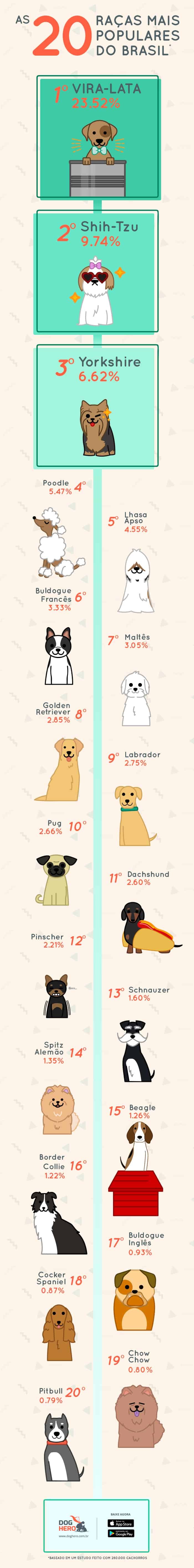 A segunda edição do Censo Canino, feito pela DogHero, levantou informações com mais de 350 mil cães cadastrados na base de clientes da DogHero e revelou as raças de cães mais populares entre os tutores de cães no Brasil. Vira-latas, shih tzu e yorkshire são as mais comuns e juntas representam quase 40% dos cachorros.