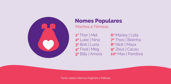 Segundo o PetCenso 2020, o maior desde a criação do levantamento pela DogHero em 2016, os nomes preferidos dos brasileiros para nomear os cachorros são Thor (1º lugar) e Luke (2º lugar) para cães machos. Para fêmeas, aparecem no topo da lista dos mais escolhidos os nomes de Mel (1º lugar) e Nina (2º lugar). O levantamento do ecossistema pet tem como base mais de 1,5 milhão de cães registrados nas empresas.